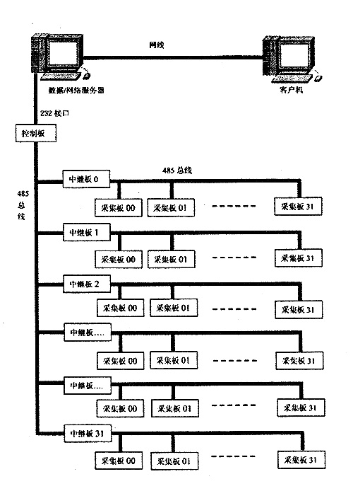 下位機為控制板、中繼板和采集板。采用兩級485總線采集數(shù)據(jù)和232接口與計算機通訊組成,如系統(tǒng)框圖所示。控制板主要完成數(shù)據(jù)上報和數(shù)據(jù)查詢,中繼板主要對接收到的控制板數(shù)據(jù)進行解釋、說明和選擇傳送以及將采集板上傳的數(shù)據(jù)轉(zhuǎn)發(fā)給控制板,采集板根據(jù)接收的數(shù)據(jù)和自己的狀態(tài)發(fā)送不同的數(shù)據(jù)。