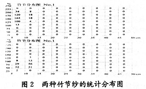 竹節(jié)間的這些差異必然影響到未來(lái)織物的風(fēng)格,精確控制竹節(jié)紗的各項(xiàng)指標(biāo)、隨時(shí)檢測(cè)竹節(jié)紗的質(zhì)量對(duì)于竹節(jié)紗生產(chǎn)廠家來(lái)說是十分關(guān)鍵的。適應(yīng)竹節(jié)紗的質(zhì)量檢測(cè)要求,CT1000外觀分析儀中專門增加了針對(duì)竹節(jié)紗測(cè)試的竹節(jié)分布圖,可以按照竹節(jié)長(zhǎng)度和門限統(tǒng)計(jì)紗線中竹節(jié)的數(shù)量,幫助用戶分析竹節(jié)紗的質(zhì)量狀況,從而達(dá)到控制竹節(jié)紗的目的。