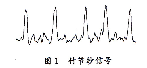 竹節(jié)紗用于在織物中添加特殊的效果,這一效果的添加通常比較隨意,決定了竹節(jié)紗的多樣性和富于變化性,對(duì)竹節(jié)紗進(jìn)行質(zhì)量控制需要從比較隨意的設(shè)計(jì)中找到規(guī)律,對(duì)生產(chǎn)的竹節(jié)紗進(jìn)行質(zhì)量判定。竹節(jié)紗中竹節(jié)的長(zhǎng)度和幅度是否在設(shè)定的范圍內(nèi)、竹節(jié)間距的分布是否符合要求、竹節(jié)紗中有無(wú)影響整個(gè)布面效果的因素都是竹節(jié)紗質(zhì)量控制的關(guān)鍵。將竹節(jié)紗在 條干儀上進(jìn)行測(cè)試,得到了竹節(jié)紗通過(guò)電容式檢測(cè)頭時(shí)所感應(yīng)出來(lái)的信號(hào)(圖1),可以看到,信號(hào)上存在很多突起,從整個(gè)紗線信號(hào)中檢出竹節(jié)部分,統(tǒng)計(jì)竹節(jié)和竹節(jié)間距,計(jì)算用于評(píng)價(jià)竹節(jié)紗質(zhì)量的各項(xiàng)性能指標(biāo),判斷竹節(jié)紗是否在設(shè)定的范圍內(nèi),是建立竹節(jié)紗質(zhì)量控制模型的基本思路。