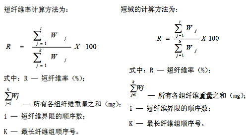 c) 短纖維含量(Short Fibre Content ):又稱短絨率,指纖維長度短于某一長度的纖維重量(根數)占試樣總重量(根數)的百分比。在快速測量短絨的測試儀中有以下幾種短絨率:
