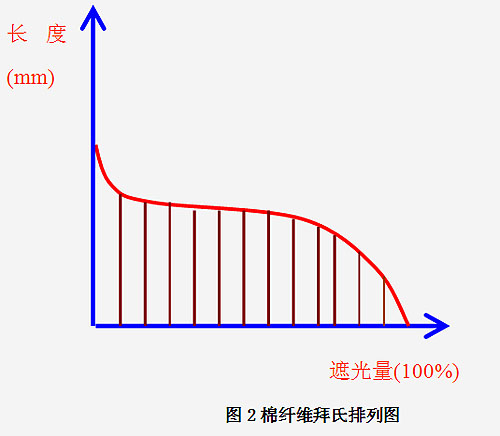 參照梳片法和羅拉法把纖維整理為一端整齊的原理,我們研制出了快速測量棉纖維短纖維含量的儀器,它的基本原理是:根據一端整齊的棉纖維由長到短的實際排列圖(見圖1)得到拜氏排列圖(見圖2),分別計算出跨距長度(3%Leff,50%Leff或其他任意設定的跨距長度)、有效長度Leff、重量短絨率(12.7mm重量短絨SFC(w)、16mm重量短絨SFC(w)-16mm)、 根數短絨率(12.7mm根數短絨SFC(n)、16mm根數短絨SFC(n)-16mm或其他任意長度的重量短絨和根數短絨等。