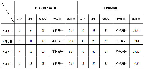(6)每班由專人挑揀收集噴出的異纖,并統(tǒng)計(jì)其重量和種類。參數(shù)調(diào)整人員負(fù)責(zé)檢查記錄及清除異纖的情況,并根據(jù)清除狀況調(diào)整相關(guān)參數(shù),確保機(jī)器的使用效果。