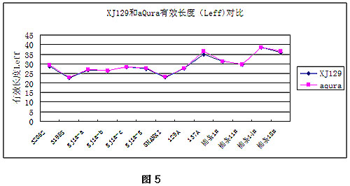 圖5為XJ129和山東某紡織廠的進(jìn)口儀器測試的Leff有效長度比對,兩者數(shù)據(jù)幾無差別,因此,在需要有效長度的應(yīng)用中可直接引用。