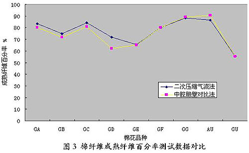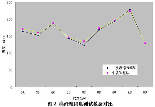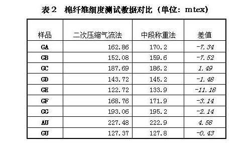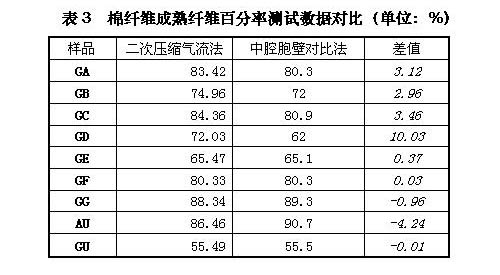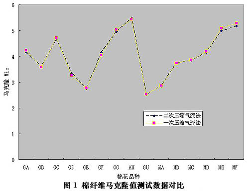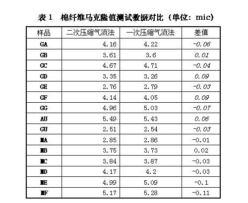 通過數(shù)據(jù)對比不難發(fā)現(xiàn),二次壓縮氣流法測試棉纖維馬克隆、細(xì)度、成熟度與一次壓縮氣流法測試棉纖維馬克隆、中段稱重法測試棉纖維細(xì)度、中腔胞壁對比法測試棉纖維成熟度結(jié)果是相當(dāng)?shù)摹?br>