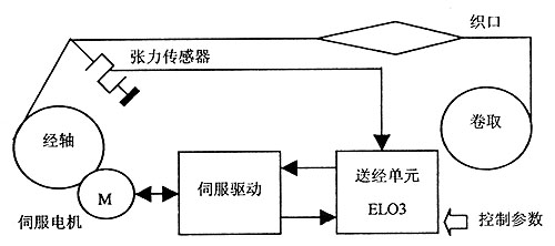 送經(jīng)控制系統(tǒng)通過檢測經(jīng)紗張力和織機主軸轉(zhuǎn)速,在保持經(jīng)紗張力恒定的情況下,不斷地將經(jīng)紗送入織口,這部分主要包括送經(jīng)單元ELO3、伺服驅(qū)動器Servodriver、伺服電機Servomotor,這是一個典型地伺服控制系統(tǒng),伺服驅(qū)動器和伺服電機構(gòu)成速度環(huán)和電流環(huán),加上送經(jīng)單元進一步構(gòu)成位置環(huán)和張力環(huán)。工作示意如圖5。送經(jīng)單元ELO3通過檢測織機主軸轉(zhuǎn)速,根據(jù)緯密計算出送出基本速度,再檢測經(jīng)紗實際張力,與目標張力比較后得出速度偏差,對基本速度進行修正,將速度指令送到伺服驅(qū)動器,伺服驅(qū)動器根據(jù)速度指令控制伺服電機精確運轉(zhuǎn),伺服電機通過減速機構(gòu)傳動經(jīng)軸送出經(jīng)紗。