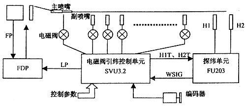 引緯系統(tǒng)是噴氣織機與其他類型織機的最大區(qū)別,它是靠氣流與紗線的摩擦力,用壓縮空氣作為緯紗載體進行引緯織造的一種無梭織機。PZK303噴氣織機電控箱的引緯控制系統(tǒng)適用于異形筘+主噴嘴+副噴嘴的引緯系統(tǒng)。這部分主要由電磁閥引緯控制單元SVU3.2和探緯單元FU203組成。SVU3.2通過控制電磁閥的開閉順序,使各種噴嘴順序噴射,完成接力引緯。FU203用于緯紗到達的探測,將緯紗的到達時刻傳給SVU3.2,SVU3.2根據(jù)緯紗到達時刻的早或晚對電磁閥的開閉時間進行修正,將緯紗的到達時刻控制在適當?shù)姆秶鷥?nèi)。系統(tǒng)工作示意如圖6。H1T、H2T為H1、H2探緯定時信號,在這兩個定時信號有效期間檢測緯紗到達,WSIG為緯紗達到信號,SVU3.2根據(jù)WSIG信號來確定緯紗的達到時刻。另外,SVU3.2還要檢測與織機主軸同步的編碼器信號,為其他單元提供運行所需的同步定時信號。
