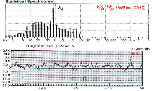 繼續(xù)降低二針車速(出條速度降為24米/分)并減小牽伸倍數(shù)(由7.2減為4.4倍),減輕牽伸負(fù)荷并進(jìn)一步使設(shè)備運(yùn)轉(zhuǎn)平穩(wěn)。由于來(lái)自頭針的毛條號(hào)數(shù)不變,此時(shí)二針的輸出毛條變粗約為11600tex。測(cè)得二針毛條波譜圖(50米/分,2分鐘)及不勻曲線圖見(jiàn)圖2。
