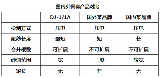 目前,國(guó)外較先進(jìn)的并紗機(jī)斷紗檢測(cè)器的主要優(yōu)點(diǎn)是:壓電式測(cè)量,采用微處理技術(shù),性能好,可靠性高,并紗支數(shù)可達(dá)120Nec,分級(jí)處理,但價(jià)格昂貴。國(guó)產(chǎn)壓電式斷紗檢測(cè)器,處理器采用數(shù)字式硬件方式,最高并紗支數(shù)可達(dá)134Nec,但可靠性低,并紗根數(shù)錠數(shù)配置固定,不易擴(kuò)展。長(zhǎng)嶺紡電DJ-1/1A斷紗檢測(cè)器的主要性能指標(biāo)均處于優(yōu)先水平,某些項(xiàng)目 達(dá)到或超過了國(guó)際先進(jìn)水平。 下表列出了國(guó)內(nèi)外的斷紗檢測(cè)器對(duì)比情況。