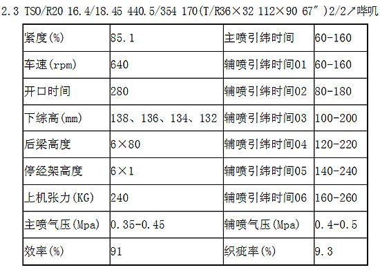 在CA082噴氣織機(jī)生產(chǎn)運(yùn)行中,組織測(cè)試了以下4個(gè)織物品種,織物品種及簡(jiǎn)明織造工藝分別如下圖:
