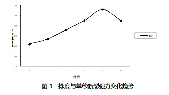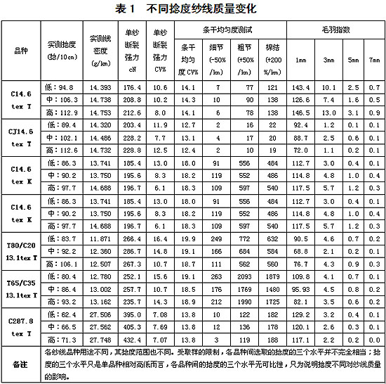捻度是衡量紗線加捻程度的一項(xiàng)參數(shù),是紗線成形卷繞、賦予紗線強(qiáng)力的基本條件。通常在紗線捻度工藝的調(diào)整中,多時(shí)只關(guān)注到捻度變化對(duì)單紗斷裂強(qiáng)力、單紗斷裂伸長(zhǎng)率的影響,而或忽略了捻度變化對(duì)紗線線密度、條干均勻度CV%、粗節(jié)、細(xì)節(jié)、棉結(jié)、毛羽等項(xiàng)目的因果關(guān)系;忽視了紗線捻度變化對(duì)紗線其它質(zhì)量變化的影響,未能采取全面質(zhì)量控制措施,由此引起客戶對(duì)紗線質(zhì)量不滿意,帶來(lái)不應(yīng)有的貿(mào)易損失。