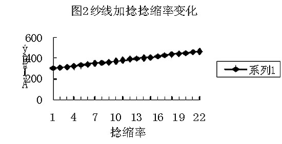 須條經(jīng)過(guò)前工序加工,原先伸直平行的纖維與紗軸發(fā)生傾斜,纖維在須條上呈螺旋形排列。須條加捻程度不同,纖維在須條中的彎曲不同,紗線片段因紗線捻度增加纖維彎曲增大,導(dǎo)致同纖維量的紗線片段長(zhǎng)度相比前羅拉輸出須條長(zhǎng)度變短,即產(chǎn)生捻縮。捻系數(shù)與捻縮率關(guān)系(如圖2)。