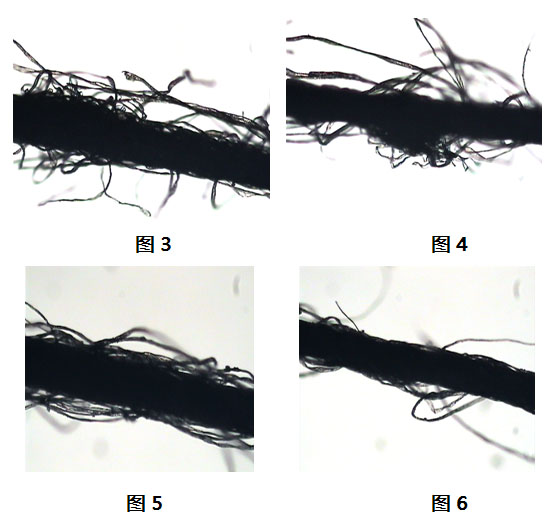 3.4.2  紗線在加捻過(guò)程中產(chǎn)生的紗線毛羽會(huì)隨著捻度的增加而減少,繼續(xù)加捻后因紗線卷繞及向心力的作用,一些伸出紗線主體的毛羽被包纏在須條主體內(nèi),或毛羽的一部分卷繞在紗線主體上,毛羽數(shù)量及長(zhǎng)度發(fā)生變化(見(jiàn)圖6),可看出毛羽數(shù)量