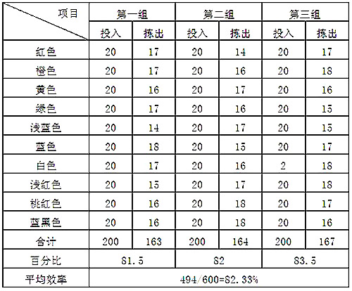 CS808棉花異纖清除機(窄通道機型)目前在西安五環(huán)集團前紡車間使用1年多,現(xiàn)場產(chǎn)線為圓盤機,每天檢測的棉花品種有三種左右,因此根據(jù)當(dāng)前品種創(chuàng)建對應(yīng)的多類器,不同的分類器設(shè)置不同的算法參數(shù),滿足配棉頻繁變化的需求。投擲樣本為硬卡紙,長度為 40mm×(2.0~3.0)mm的十種紙條(紅色、橙色、黃色、綠色、淺藍(lán)色、藍(lán)色、白色熒光、淺紅色、桃紅色、藍(lán)黑色),每種20個,所有樣本混合后,在距離檢測通道前正中間開一個8mm小孔,在棉花通過檢測區(qū)域時,在該小孔投放樣本,投放完畢后從廢棉中檢出投放樣本,試驗結(jié)果如下表所示。