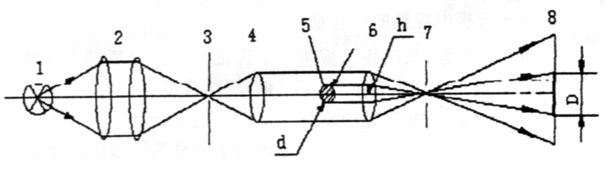 光電式條干測量是在紗線快速通過檢測區(qū)且紗線本身有抖動的狀態(tài)下進行的非接觸瞬時測量,所以測量的光學(xué)系統(tǒng)應(yīng)是一個遠心光路系統(tǒng)。其原理如圖2所示,光源1經(jīng)過聚光透鏡2聚焦于光欄3,由準直物鏡4形成準直光束,對紗線5作背景照明,再經(jīng)投影物鏡6在光電接收器靶面上形成放大的陰影像D,對這個陰影像進行測量,可達到紗線直徑測量之目的,此方法也稱投影放大法。在光學(xué)上,紗線直徑測量可用下式表達: