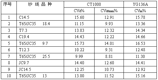 使用陜西長嶺紡織機電科技有限公司生產(chǎn)的YG136A條干均勻度測試分析儀和CT1000紗線外觀分析儀對10種紗線進行測試,