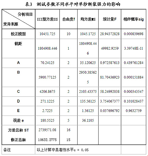 由F分布給出的因子A、因子D、 因子E相伴概率均大于0.05,說(shuō)明三因子在顯著性水平ɑ = 0.05上與上對(duì)測(cè)試結(jié)果的影響勻不顯著,并且其中因子A、因子E均小于誤差e=180.5525,是影響單紗斷裂強(qiáng)力各參數(shù)中最小的兩個(gè)因子。以上三因子對(duì)于單紗斷裂強(qiáng)力的貢獻(xiàn)大小,與樣本本身的離散性大小直接相關(guān),本案例預(yù)加張力小于測(cè)試次數(shù)的III型方差,或緣于這個(gè)樣本的離散性。