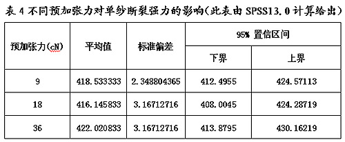 標(biāo)準(zhǔn)規(guī)定的單紗斷裂強(qiáng)力施加0.5±0.1cN/tex,對(duì)于一個(gè)測(cè)試樣品而言,標(biāo)準(zhǔn)給出的不是一個(gè)確定值,而是一個(gè)可以選擇的范圍。按照標(biāo)準(zhǔn)規(guī)定的預(yù)加張力,它可以施加0.5cN/tex的預(yù)加張力,也可以施加0.4cN/tex、0.6cN/tex的預(yù)加張力。通過(guò)正交試驗(yàn)可以看出,不同的預(yù)加張力對(duì)單紗斷裂強(qiáng)力產(chǎn)生不同的影響,見(jiàn)表3,同一個(gè)樣品因預(yù)加張力的選擇不同由此產(chǎn)生測(cè)量不確定度,這也成為不同試驗(yàn)室測(cè)試同一樣品測(cè)試結(jié)果不一致的原因之一。不同預(yù)加張力對(duì)單紗斷裂強(qiáng)力的影響見(jiàn)4。