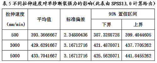 從正交試驗(yàn)表3可以看出,拉伸速度產(chǎn)生的III型方差SS為5900.77125,是正交試驗(yàn)中影響最大的因子,不同拉伸速度對(duì)單紗斷裂強(qiáng)力的影響見(jiàn)表5。GB/T3916-2013規(guī)定采用500mm/min的拉伸速度,“僅對(duì)自動(dòng)試驗(yàn)儀,根據(jù)協(xié)議允許較高的拉伸速度。我國(guó)的單紗斷裂強(qiáng)力測(cè)試方法從原來(lái)的定時(shí)斷裂20s,發(fā)展到現(xiàn)在的等速拉伸;而我國(guó)的紡織織造也從原來(lái)的有梭織機(jī),發(fā)展到現(xiàn)在的劍桿織機(jī)、片梭織機(jī)、噴水織機(jī)、噴汽織機(jī);引緯速度也從有梭織機(jī)的240m/min左右發(fā)展到無(wú)梭織機(jī)的1900m/min左右,織造速度較原來(lái)有了很大提高,織造過(guò)程中紗線的受力情況發(fā)生很多變化。從標(biāo)準(zhǔn)反映實(shí)際應(yīng)用角度講,GB/T3916規(guī)定的500mm/min不能與現(xiàn)在的織造速度相應(yīng),測(cè)試結(jié)果對(duì)現(xiàn)實(shí)生產(chǎn)的指導(dǎo)意義由此受到影響。建議采用400%的隔距長(zhǎng)度每分鐘或者1000%的隔距長(zhǎng)度每分鐘的拉伸速度”,也即可采用2000mm/min與5000mm/min的拉伸速度。