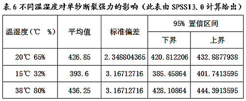 從正交試驗(yàn)表3可以看出,不同溫度產(chǎn)生的III型方差SS為4206.8675,是正交試驗(yàn)影響單紗斷裂強(qiáng)力僅次于拉伸速度的因子,不同溫濕度對(duì)單紗斷裂強(qiáng)力的影響見(jiàn)表6。