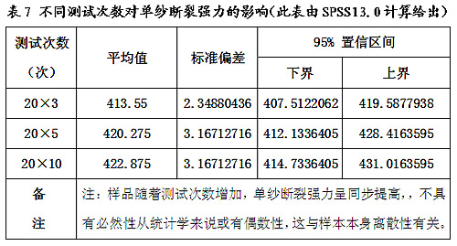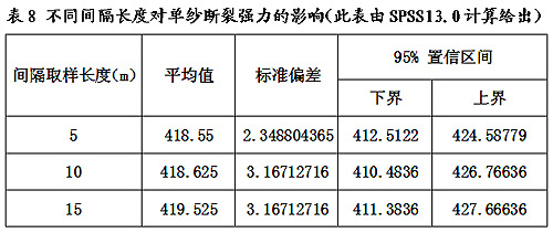 采用不同的管紗數(shù)量與不同的測(cè)試次數(shù),及不同測(cè)試次數(shù)間隔長(zhǎng)度不同,關(guān)系到樣本采用與利用的程度,關(guān)系到測(cè)試信息的是否充分,這些都會(huì)賦予單紗斷裂強(qiáng)力測(cè)試的測(cè)量不確定度,影響到對(duì)于一批紗線產(chǎn)品評(píng)估的準(zhǔn)確性和可靠性。測(cè)試次數(shù)與間隔長(zhǎng)度不同對(duì)單紗斷裂強(qiáng)力的影響到見(jiàn)表7、表8。