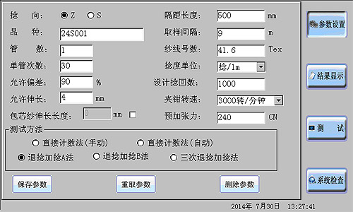 2.將管紗通過紗架引紗到主機(jī)換紗架上之后,即可開始測(cè)試。在開始測(cè)試之前,應(yīng)在觸摸屏參數(shù)設(shè)置界面上設(shè)置相關(guān)參數(shù)。