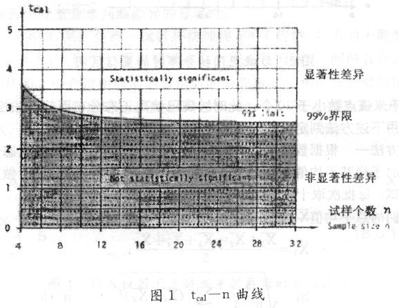 查圖1所給的tcal—n曲線,相應(yīng)式樣個(gè)數(shù)n=10時(shí)分界線上的t值為2.8 (可信度99%),現(xiàn)計(jì)算所得的tcal<2.8即位于陰影區(qū)內(nèi),說明上述對(duì)千米棉結(jié)數(shù)的兩測試結(jié)果不存在顯著性差異。