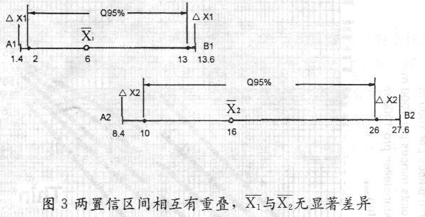 顯然此時(shí)的置信區(qū)間對(duì)均值而言是不對(duì)稱的。A1B1與A2B2兩線段能夠相互重疊,可判定上述兩測試結(jié)果X1與X2沒有顯著差異。