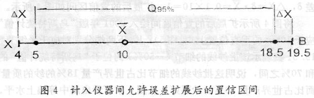 從圖2中查得相應(yīng)X的置信區(qū)間為5至18.5;再計(jì)入儀器間允許誤差δ,△X=δ•X =0.1×10=1,擴(kuò)展后的置信區(qū)間如圖4所示。
